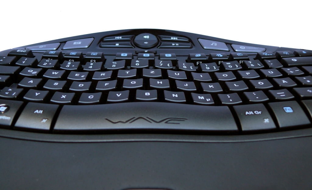 Die Testtage auf dieser Tastatur bescherten uns ein vollkommen neues Schreibgefühl. Durch das leicht gedrehte Layout werden die Handgelenke seitlich entlastet, die gepolsterte Handballenauflage ermöglicht diese Entlastung auch nach oben und unten. Die unterschiedliche Höhe der Tasten verringert merklich die Wege, die die Finger zurücklegen.