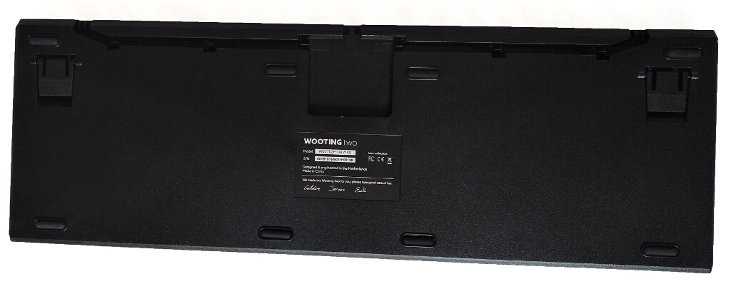 Die schlichte, schwarze Wooting two mit 460 mm Länge und 150 mm Breite ist kompakt. Durch die normale Schalterhöhe ist die Tastatur mit eingeklappten Füßen 39 mm hoch. Das Gewicht beläuft sich wegen der Aluminium-Oberseite auf 950 Gramm. Zudem ist die Wooting one mit N-Key-Rollover und einer Polling-Rate von 1.000 Hz auf dem aktuellen Stand der Technik. Eine stufenlos-regulierbare RGB-LED-Beleuchtung mit vorprogrammierten Beleuchtungseffekten sorgt für optische Untermalung der Tastatur. Die benötigte Software Wootility muss aus dem Internet heruntergeladen werden und ist installiert etwa 190 MB groß (getestete Version 3.3.3). Anschluss findet die Wooting one mittels des im Lieferumfang enthaltenden ummantelten USB-A-zu-C-Kabel. Dieses kann an der Hinterseite links, mittig und rechts herausgeführt werden. Die Wooting two ist zu Windows 7/8/10 sowie mit Mac OSX und Linux kompatibel. Bei den letzten beiden Betriebssystemen könnte es wegen der Verwendung von XInput zu Problemen mit den Analogfunktionen kommen.