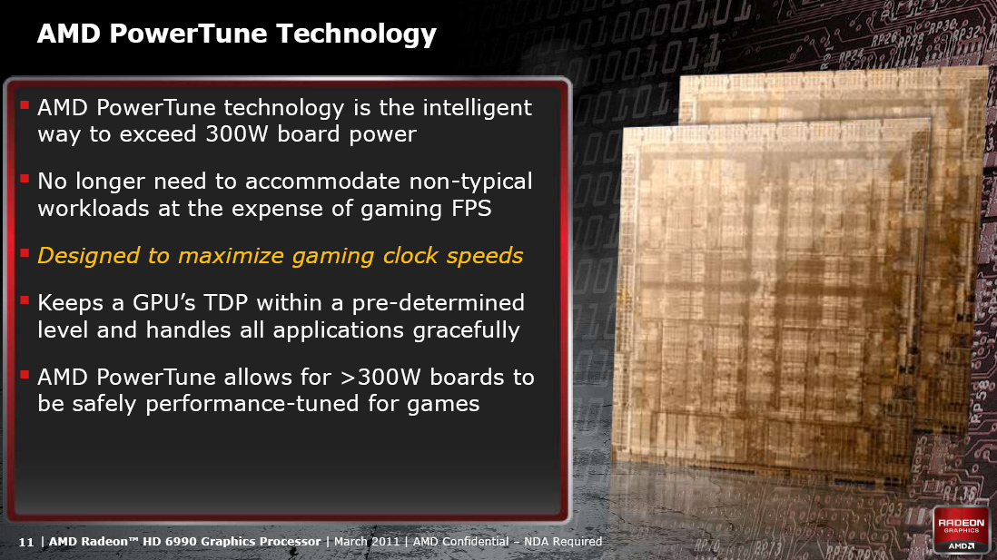 Wie bereits im Vorwort erwähnt, handelt es sich bei den verwendeten GPUs auf der Radeon HD 6990 um keine Neuentwicklung. Stattdessen setzt AMD auf zwei Cayman-Grafikchips mit veränderten Frequenzen, gepaart mit insgesamt 4096 MB GDDR5-Speicher (jeweils 2048 MB je Chip, angebunden über ein 256 Bit Interface). Der Speicher wird mit effektiv 2,5 GHz betrieben und erreicht somit einen Durchsatz von 160 GB/s, was dem Wert einer Radeon HD 6950 entspricht. Für die flotte Berechnung komplexer Grafiken stehen der HD 6990 insgesamt 768 Shader-Einheiten (4-dimensional, 384 pro GPU) zur Verfügung. Durch die Betriebsfrequenz von 830 MHz ergibt sich eine Rechenleistung von 2550 GFLOPs (IEEE754-SP) pro Chip bzw. 5100 GFLOPS für die gesamte Karte.