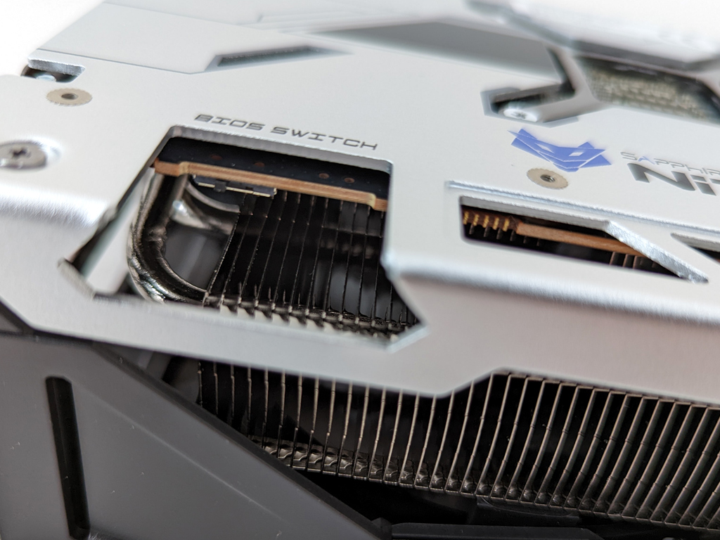 Typisch für die NITRO+ Ausführungen von Sapphire ist ein Dual-BIOS mit entsprechender Umschaltfunktion. Über einen BIOS-Schalter an der Grafikkarte kann der Nutzer zwischen verschiedenen UEFI-Versionen wählen und die Karte in grundlegend unterschiedlichen Modi betreiben. Ab Werk befindet sich die NITRO+-Karte im Performance Mode, was in 2.524 MHz Gametakt (+114 MHz bzw. 4,7 Prozent) und 2.694 MHz Boosttakt (+59 MHz bzw. 2,2 Prozent) resultiert. Alternativ gibt es noch einen Silent Mode, der den Schwerpunkt auf einen flüsterleisen Betrieb legt. Bei diesem Modus werden Zieltakte verringert und Zieltemperaturen erhöht, um einen potenziell ruhigeren Betrieb zu ermöglichen. Die dritte Stellung des BIOS-Schalters erlaubt die Einstellung per TriXX-Software, über die auch ein weiterer Modus namens TOXIC BOOST möglich ist. Der Speichertakt der 8 GB GDDR6 bleibt unverändert und beträgt 8.750 MHz.